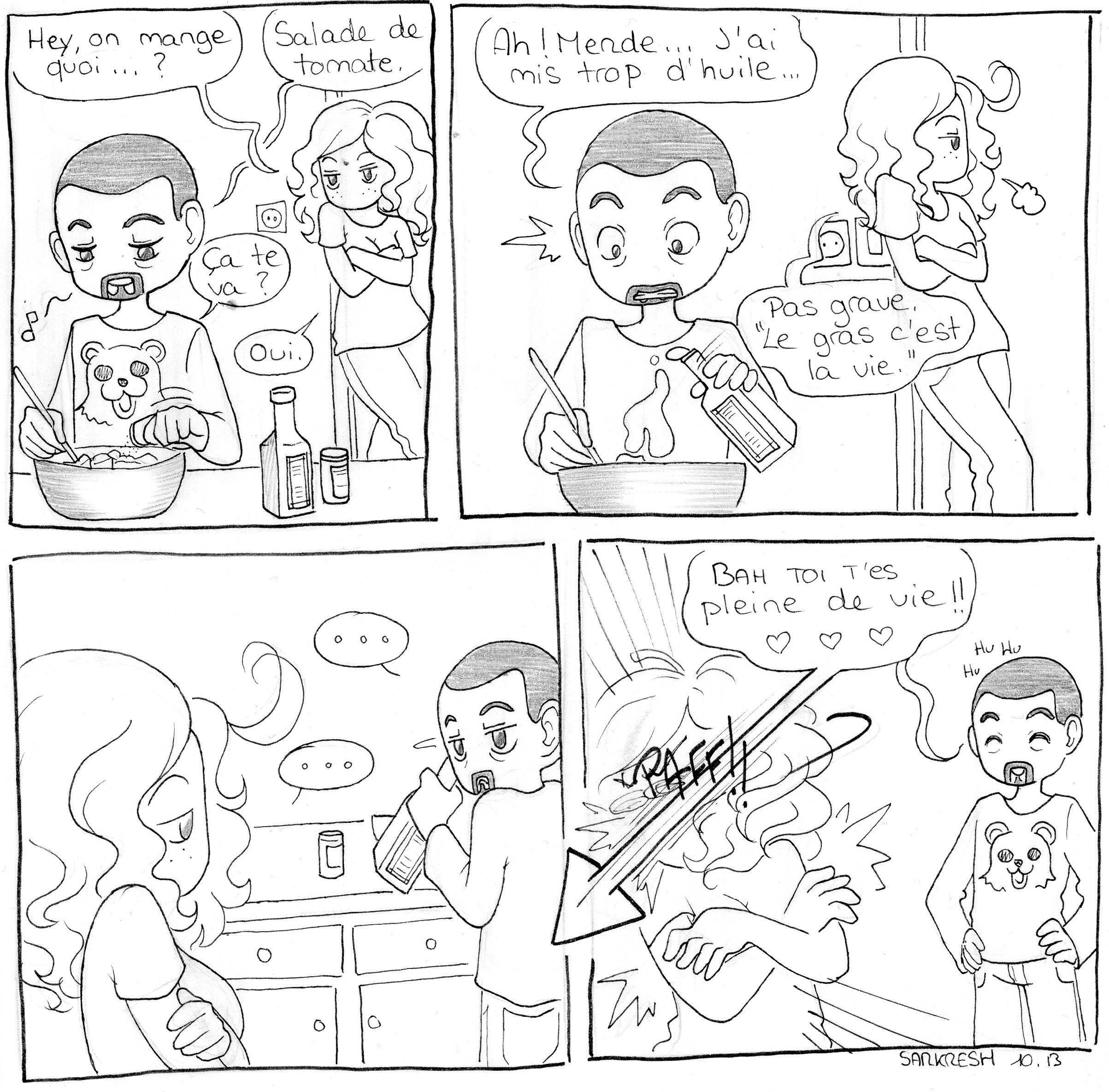 J'imagine que vous êtes bien surpris de me revoir faire des strips. La raison est toute simple : j'ai pété mon stylet de Cintiq. Donc en attendant que mon bébé chou d'amour soit de nouveau fonctionnel ; j'ai repris le dessin traditionnel. Un peu moins élaboré que mes strips sur tablette mais tellement plus rapide.. J'en ferais p'tet d'autres.
